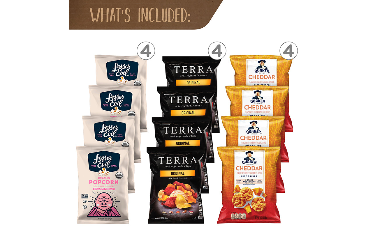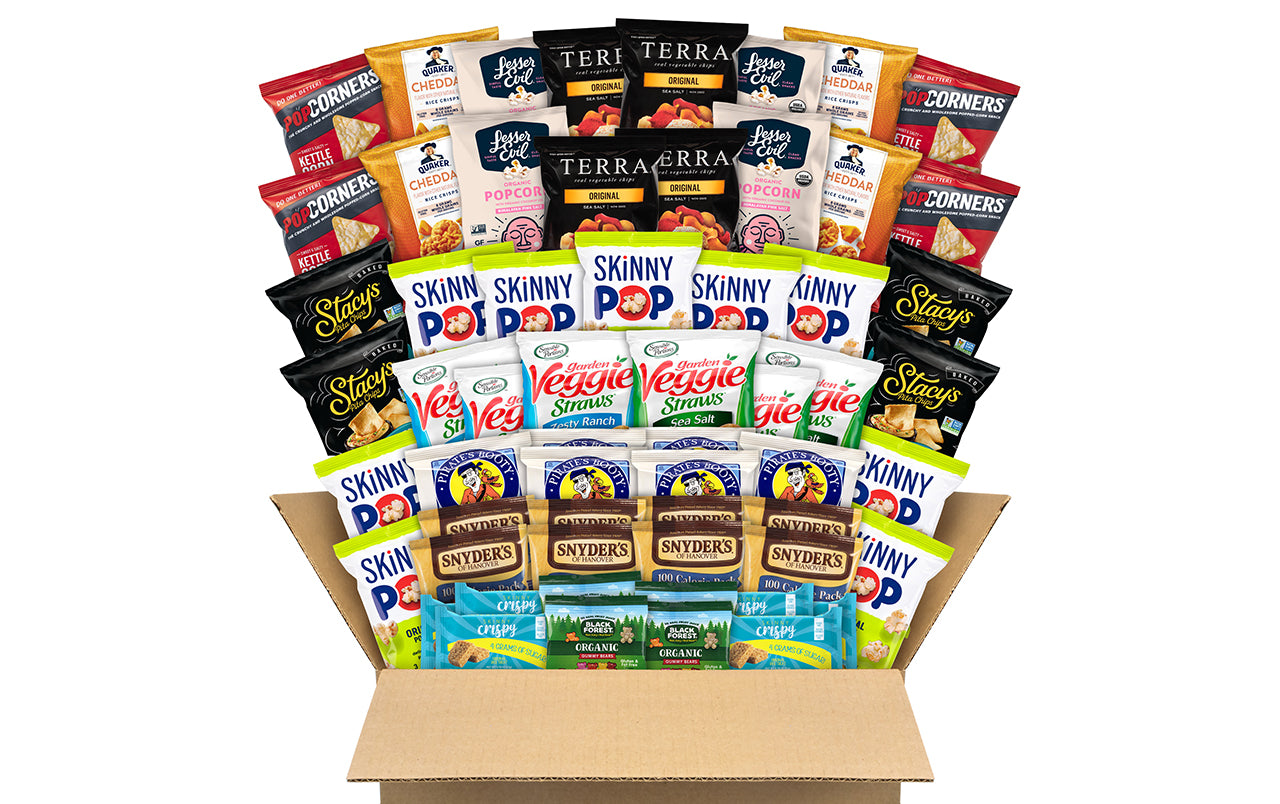 You'll be snacking healthy for days with this Big Healthy Snack Box. Unpack this large snack box and you'll find 61 snacks that will help you avoid overly sugary snacks and candy. Stonyfield Organic Fruit Snacks, Fiber One Bars, Pirate's Booty, Veggie Straws, Snyder's Mini Pretzels, Stacy's Pita Chips, Popcorners, Quaker Popped, and Kellogg's Cracker snacks are all packed into this huge box. Perfect for refilling the cabinets at home, for sharing at your next party, or for offering to employees in the breakroom. Grab one of these Big Healthy Snack Boxes and enjoy the great flavor of healthier snacks. Each Big Healthy Snack Box comes with a smaller snack box inside, with other snack bags on top. Products may vary by flavor per brand and substitutions may be made due to availability.