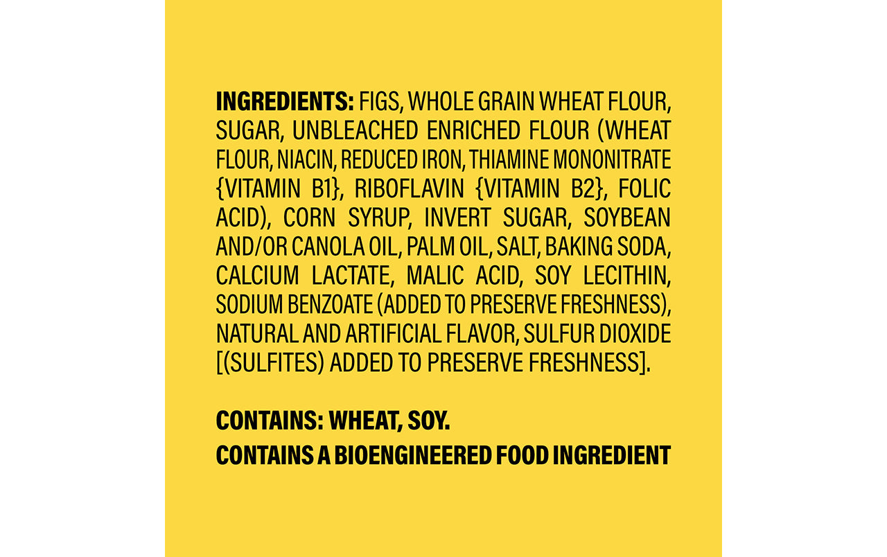 Figs, High Fructose Corn Syrup, Whole Grain Wheat Flour, Unbleached Enriched Flour (Wheat Flour, Niacin, Reduced Iron, Thiamine Mononitrate, Riboflavin, Folic Acid), Corn Syrup, Sugar, Soybean Oil, Partially Hydrogenated Cottonseed Oil, Salt, Baking Soda, Cultured Dextrose, Calcium Lactate, Malic Acid, Soy Lecithin, Natural And Artificial Flavor, Sulfur Dioxide Added To Preserve Freshness, Whey (From Milk).