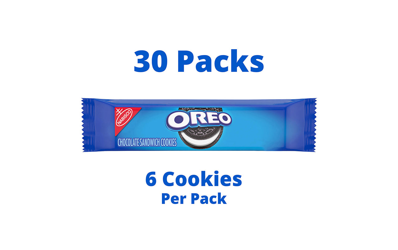 A 30 count box of Nabisco's Single Serve 2 Pack Oreo Cookies. Easily portable chocolate wafers with Oreo's classic creme filling. A crowd pleasing favorite to bring to school, work or keep all for yourself with a glass of milk. With 6 cookies per package you'll be sure to get your chocolate cookie fix. Kosher friendly to accommodate dietary restrictions.