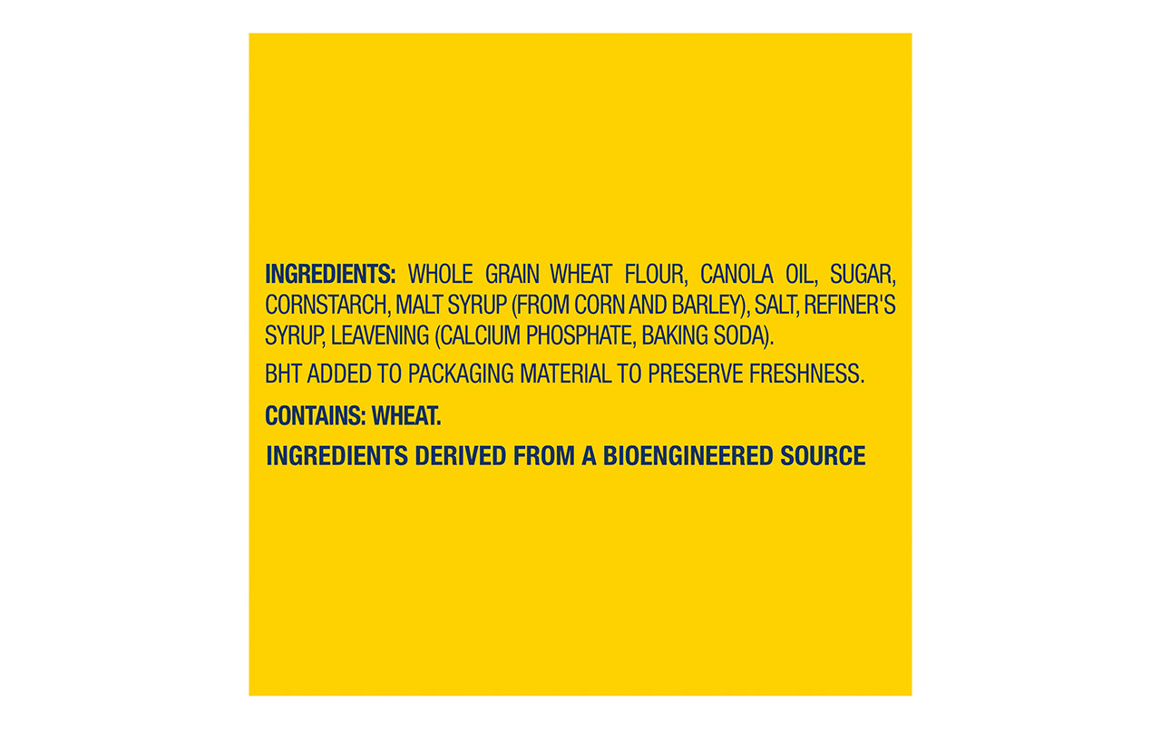 Whole Grain Wheat Flour, Soybean Oil, Sugar, Cornstarch, Malt Syrup (From Corn And Barley), Salt, Refiners Syrup, Leavening (Calcium Phosphate And/Or Baking Soda), Vegetable Color