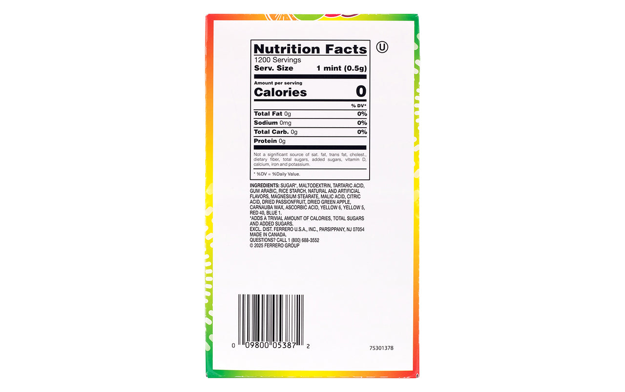 Sugar, Dextrin, Gum Arabic, Tartaric Acid, Rice Starch, Natural And Artificial Flavors, Malic Acid, Magnesium Stearate, Citric Acid, Dried Acerola Extract, Dried Green Apple, Carnauba Wax, Ascorbic Acid, Yellow 6, Yellow 5, Red 40, Blue 1